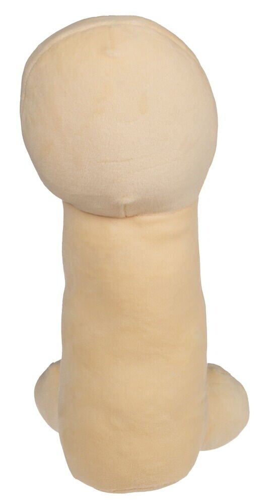Een te leuke nude-kleurige pluche penis met geborduurde lachende mond en ogen op de eikel. Staat of zit op zijn bolvormige pluche testikels. Zacht en donzig, stevig gevuld met een fluweelzacht oppervlak.